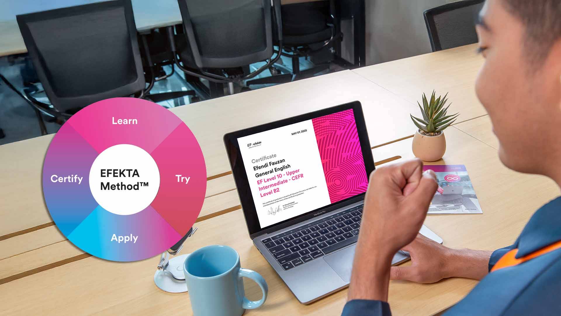 Sertifikat bahasa Inggris, yang diresmikan oleh Hult International Business School -- sekolah MBA top di Amerika, akan dikirim kepada Anda ketika Anda telah menyelesaikan seluruh kursus kami sebagai bukti akan performa Anda di EF EFEKTA dan kemampuan Bahasa Inggris Anda di perusahaan dan universitas.